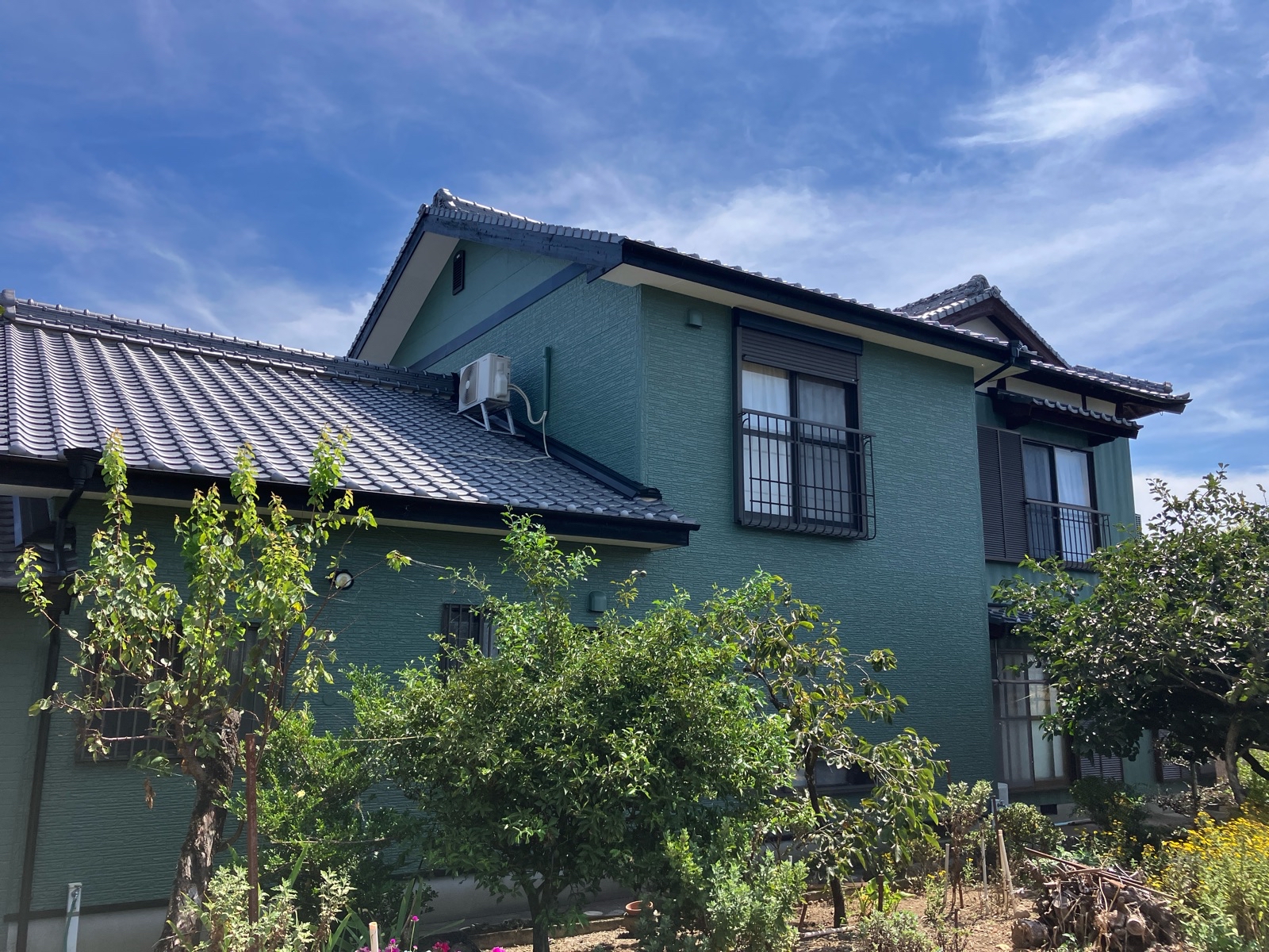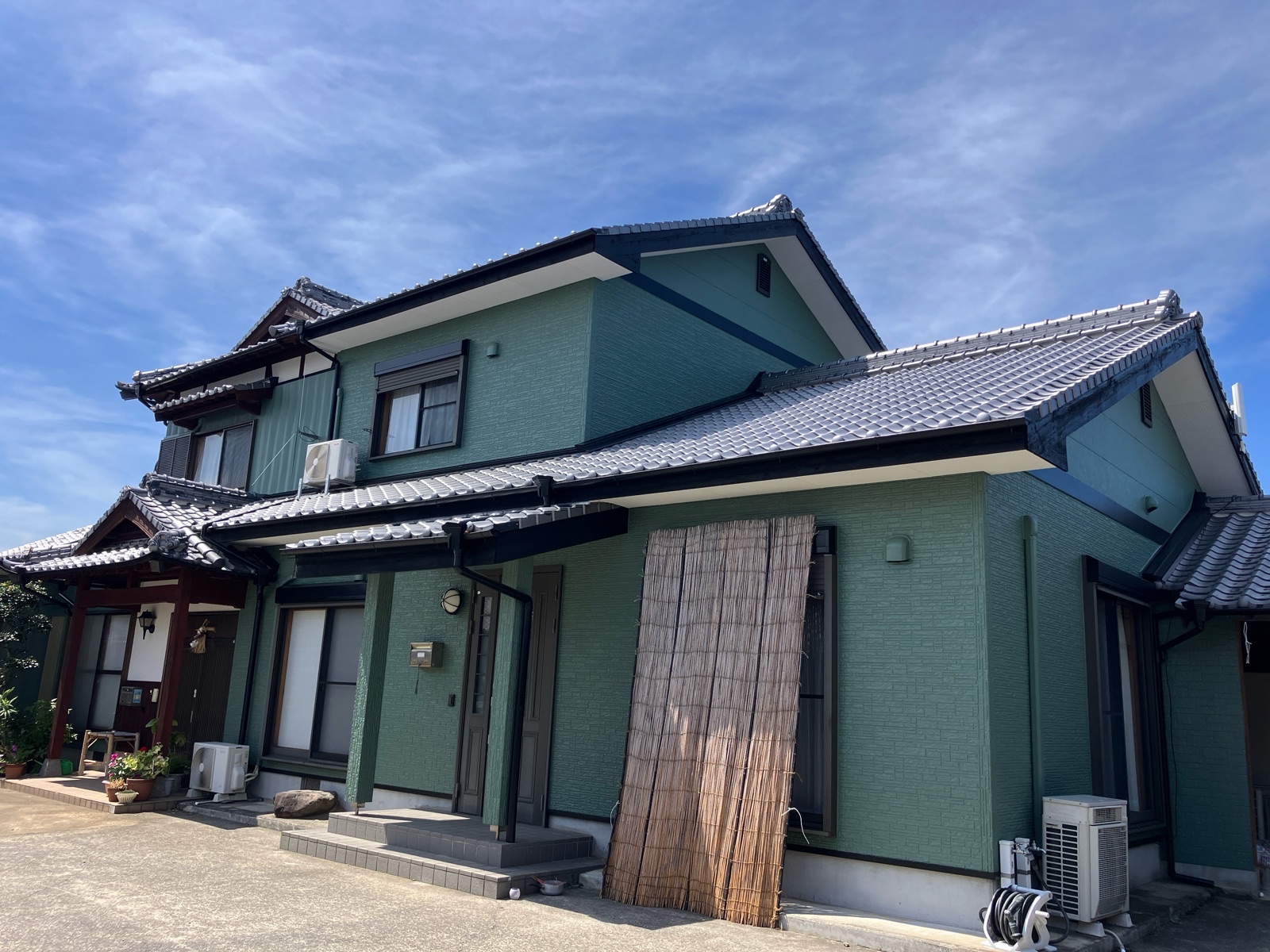 ご安全に、太陽塗装です! 元々明るいベージュ系の壁色から緑系に塗装を決められたお客様。 色もしっかりと入り、かっこよくガラリと家の印象が変わりましたね!