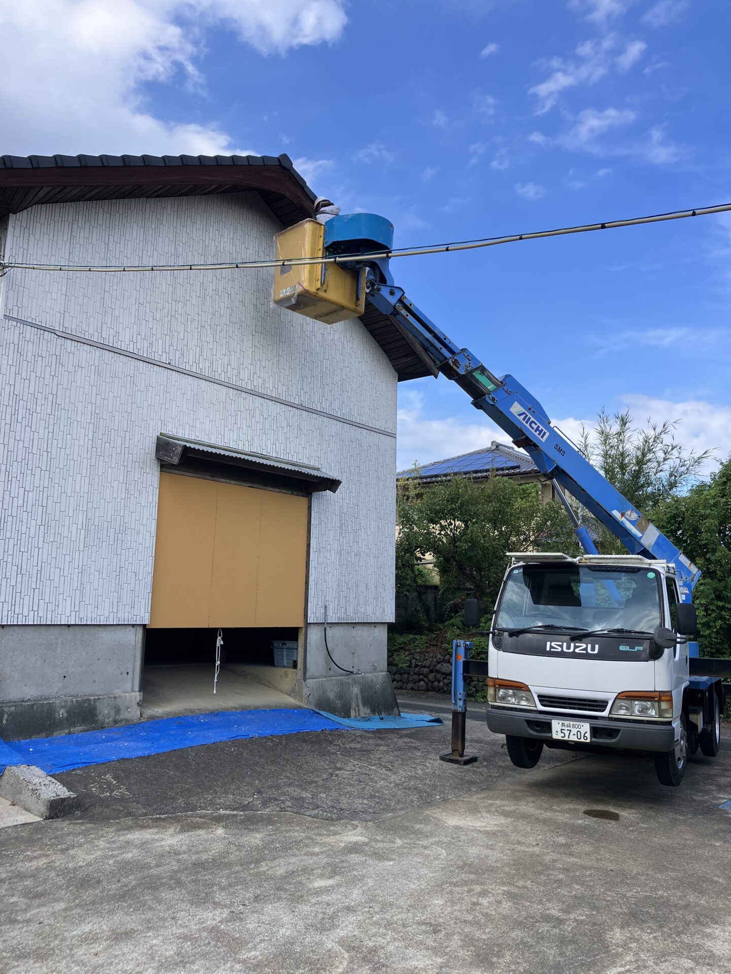 ご安全に高所作業車で倉庫の破風板の塗装をしました。